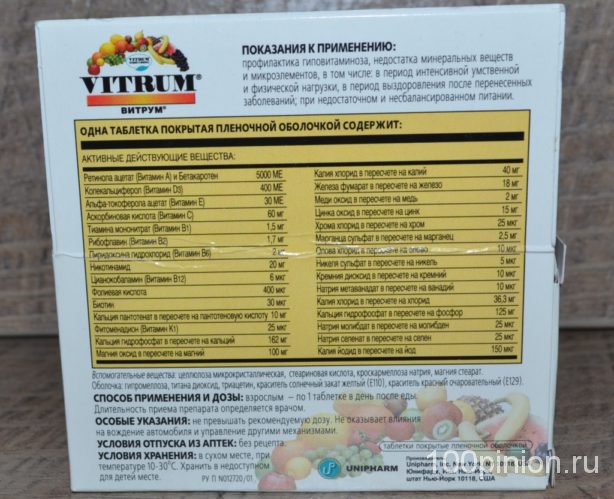 Как я принималаVitrum: брала 1 таблетку и запила водой после еды всего раз в день. Мне такая схема удобна, тем более есть баночки с 30-ю таблетками. Как правило, нужно пропивать витамины месяц, а потом после перерыва в таком же интервале, начать прием заново. Если наступило лето, то конечно, можно восполнять недостающие полезные элементы свежими фруктами и овощами (не импортными).